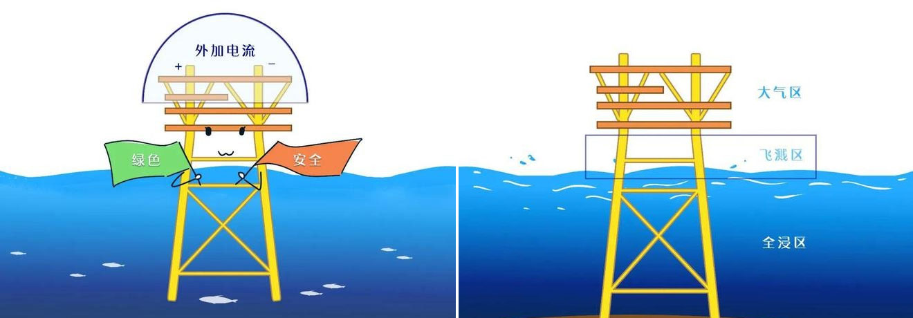 浪濺區與潮差區均為干濕交替區, 表面鹽含量高于大氣區,海水氧含量高于全浸區,同時海水中夾雜的泥沙和海面浮游物體對其進行沖刷撞擊,因此形成了最為苛刻的腐蝕環境。一般腐蝕速率為 0.3-0.5mm/ 年,最高可大 1mm/ 年,約為全浸區的 3-10 倍。