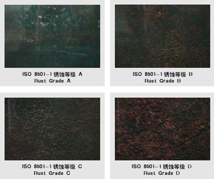 鋼材表面的銹蝕程度分別以A、B、C 和D 四個銹蝕等級表示,文字描述如下: