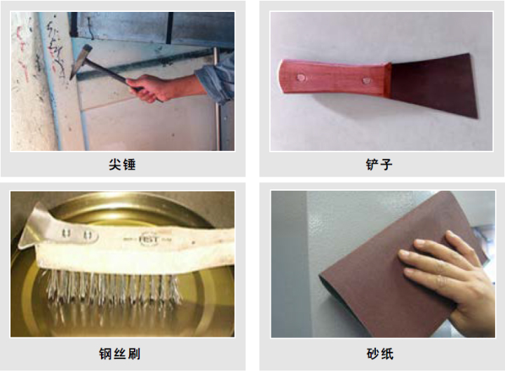 手工工具包括:尖錘、鏟子、鋼絲刷、砂紙