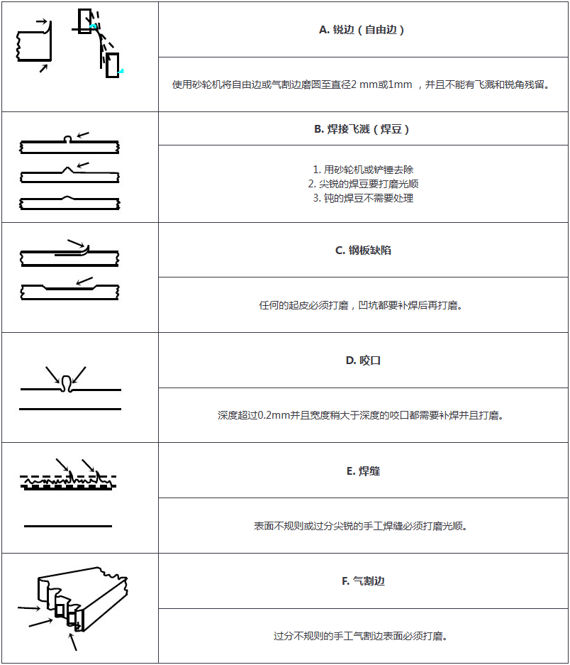 (1)結構處理:對于底材本身必須進行一定的處理,如銳邊的打磨倒角的磨圓,飛濺的去除,焊孔的補焊及磨平。