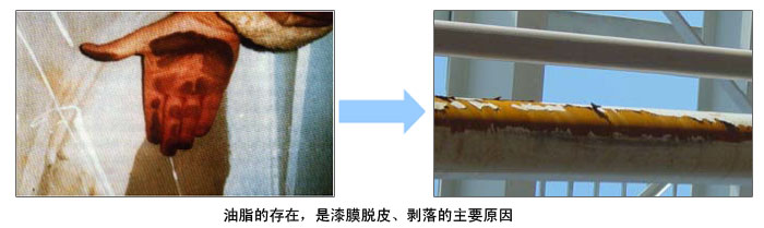 大多數涂料與油脂有著排斥力,大于油脂的吸引力。底材有油脂就會引起縮孔、附著力差等問題。而且越是高性能的涂料如環氧,聚氨酯涂料,此時的附著力越不如常規的油性涂料。大量的油脂先要刮去,而后用溶劑(脂肪烴或松香水)擦洗,然而這往往使油污表面擴大,情況更糟。所以要重復幾次,每次用干凈的抹布擦過才有效。商用化學清洗劑對除油很有效,但必須確認對涂層無害。用熱水清洗也很有效。
