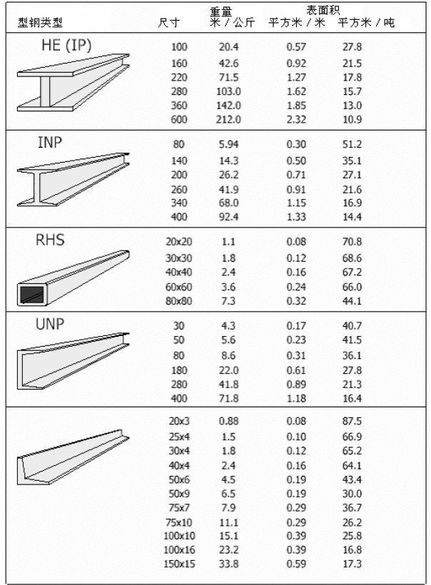 只要知道其尺寸(單位:mm),我們可以按計算出各類型鋼的每米的面積和每噸的面積。