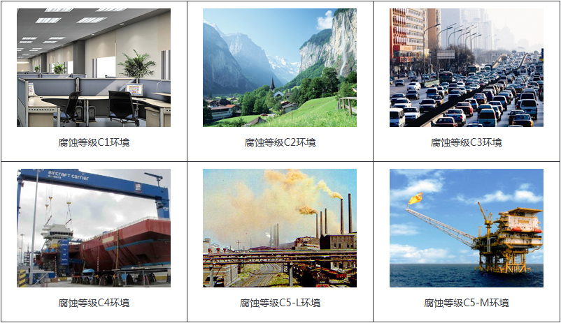 C5-I | 很高 (工業(yè)) | 高鹽度和惡劣大氣的工業(yè)區(qū)域 | 總是有冷凝和高濕的建筑和地方 |